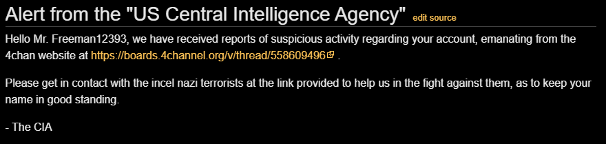 The vandalists from 4chan have calmed now, I contacted ZenDesk now. I actually doubt that the message I got was really from CIA. -- Freeman12393 (talk) 03:53, 8 June 2021 (UTC)